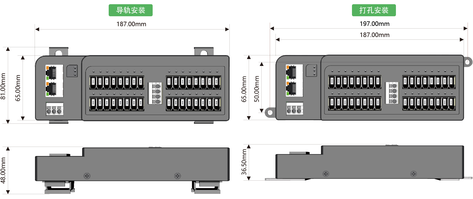 安裝方式:DIN35導(dǎo)軌安裝或雙側(cè)耳打孔安裝