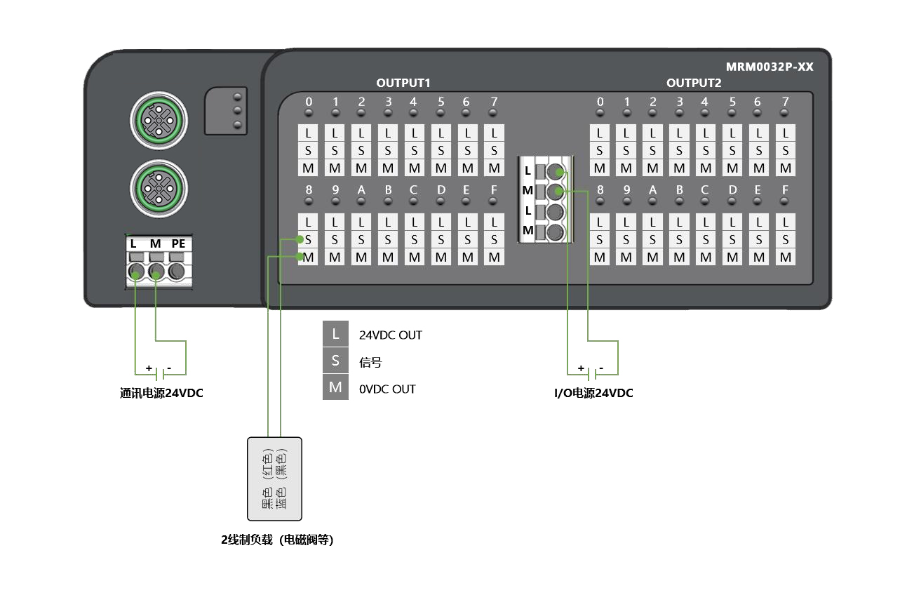 面板式快接線分布式I/O,EtherNet/IP通訊,2xM12,可級聯;數字量32出 PNP,24VDC,0.5A,E-con連接器;導軌安裝&打孔安裝(下單時需備注)