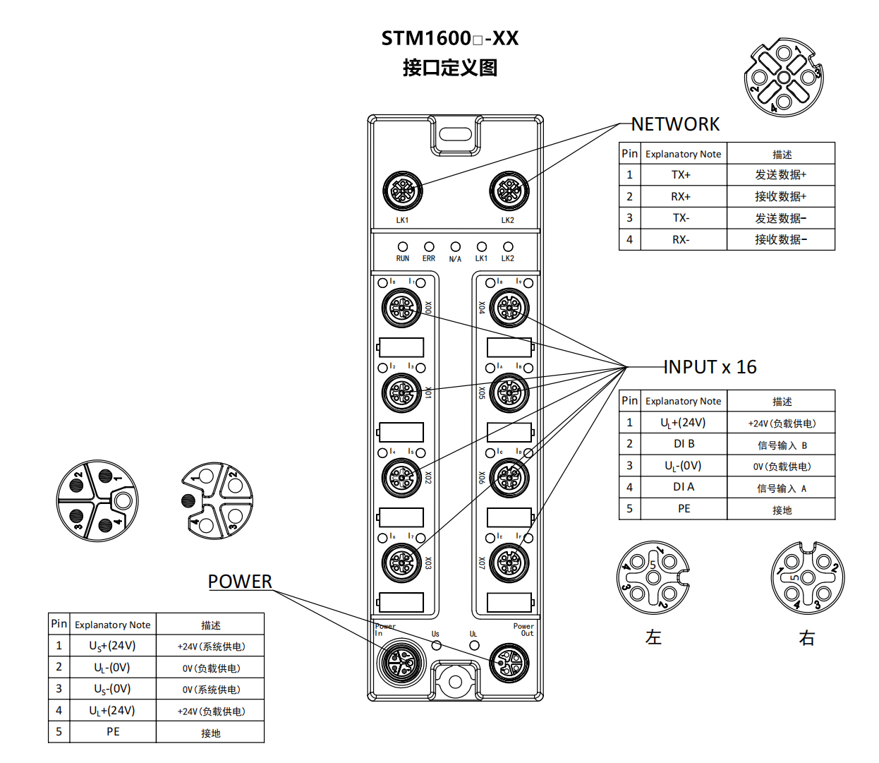 電源接口:Power In:1×M12,L-Code,4P針;Power Out:1×M12,L-Code,4P孔(最大電流16A)